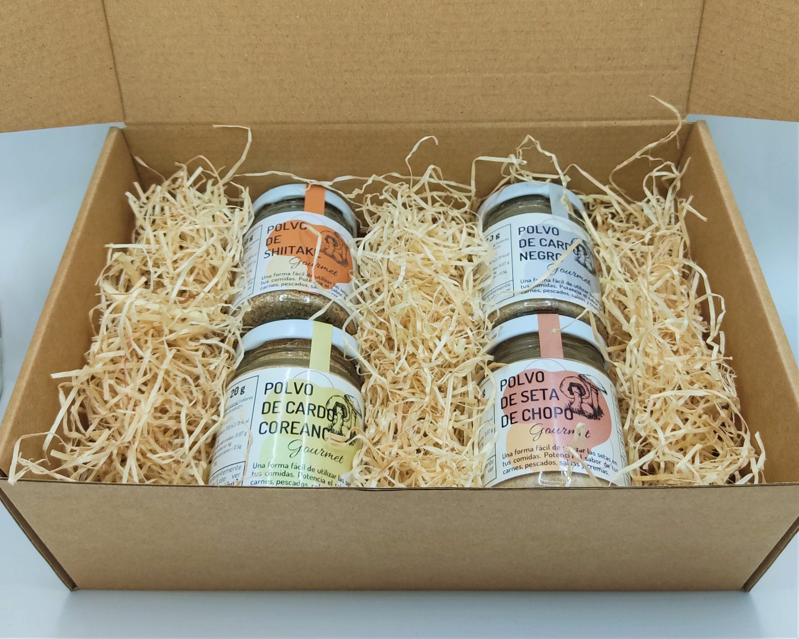 Consta de 4 bolsas de setas deshidratadas y 4 tarros de polvo de setas de las variedades seta de chopo, cardo negro y cardo coreano.